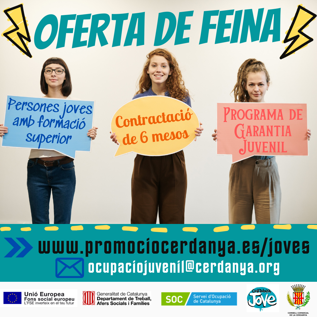 Si vols estar al corrent d'aquest programa o d'altres relacionats amb l'ocupació juvenil posa't en contacte amb la Clàudia Sala, la referent d'ocupació juvenil del Consell Comarcal; envia un correu a ocupaciojuvenil@cerdanya.org i t'assessorarem en les teves inquietuds ocupacionals al nostre territori.
